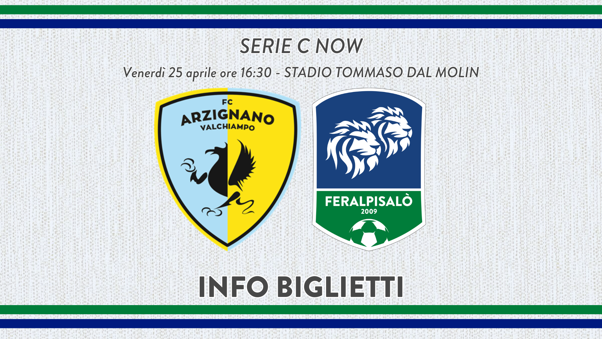 Feralpisalò comunica che i biglietti per il settore ospiti per la partita Arzignano-Feralpisalò, gara valida per la trentottesima giornata del Campionato Serie C Now, in programma venerdì 25 aprile alle 16:30 allo Stadio Tommaso Dal Molin di Arzignano, sono disponibili sul sito Ticketone.
