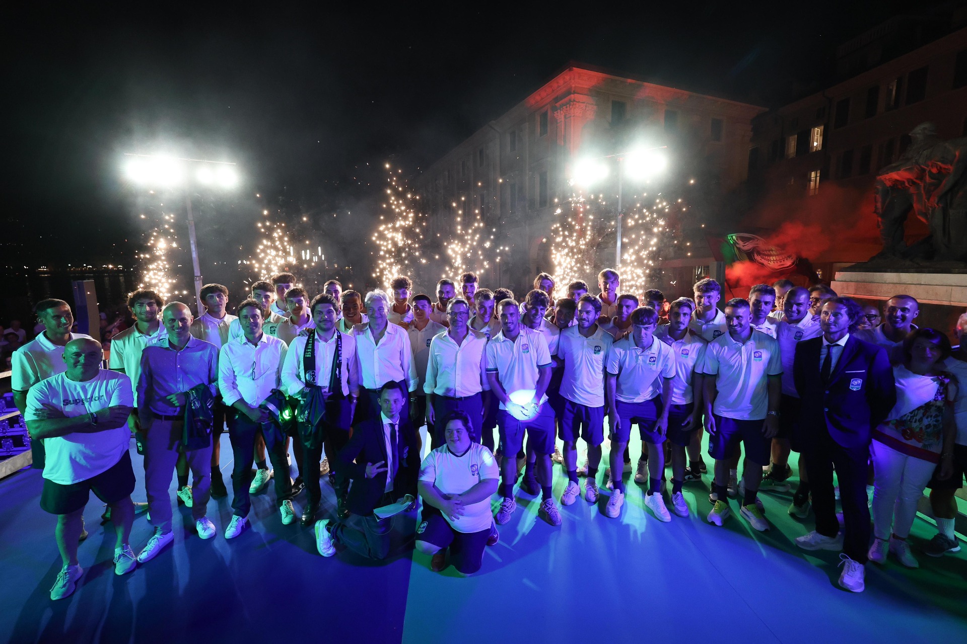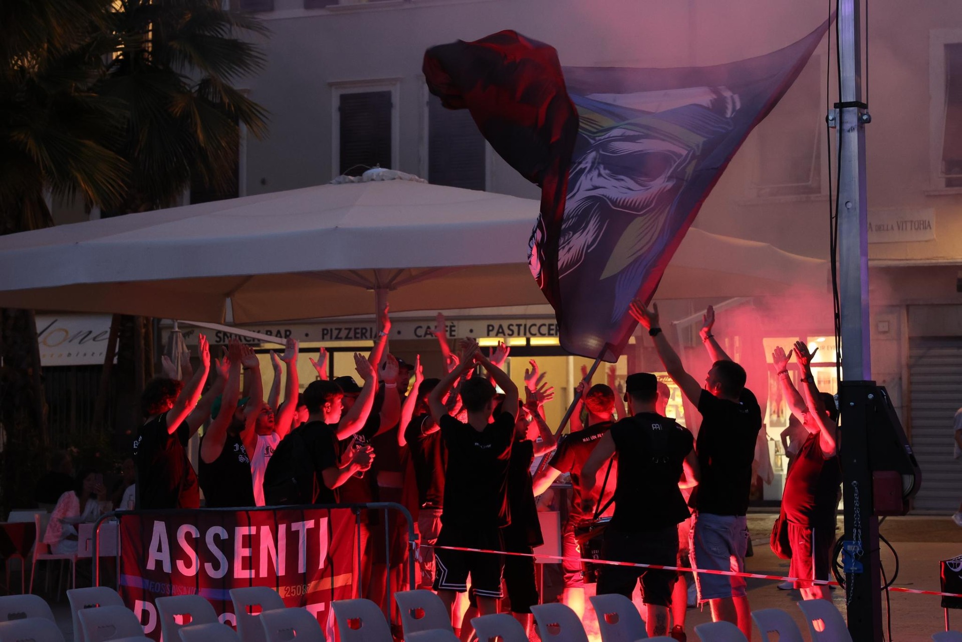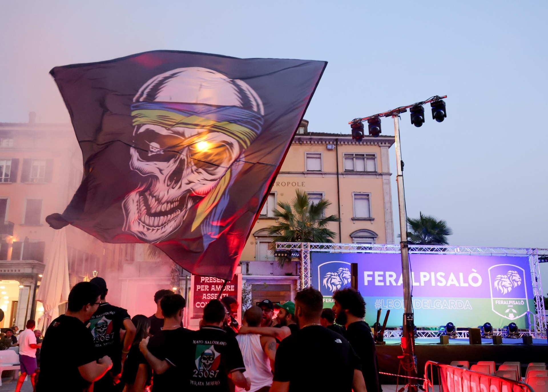 Scambio di maglie e di vessilli. Un simbolismo forte come il saluto dei tifosi in piazza della Vittoria, il salotto più elegante del Garda.
